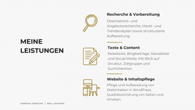 Ich arbeite strukturiert, sorgfältig und mit hohem Qualitätsanspruch. Mein Ziel ist es, komplexe Informationen so aufzubereiten, dass sie als verlässliche Grundlage für Planung, Content und Kommunikation dienen – ohne dass viel Abstimmungsaufwand entsteht. Klare Absprachen und eine angenehme, transparente Zusammenarbeit sind für mich selbstverständlich.